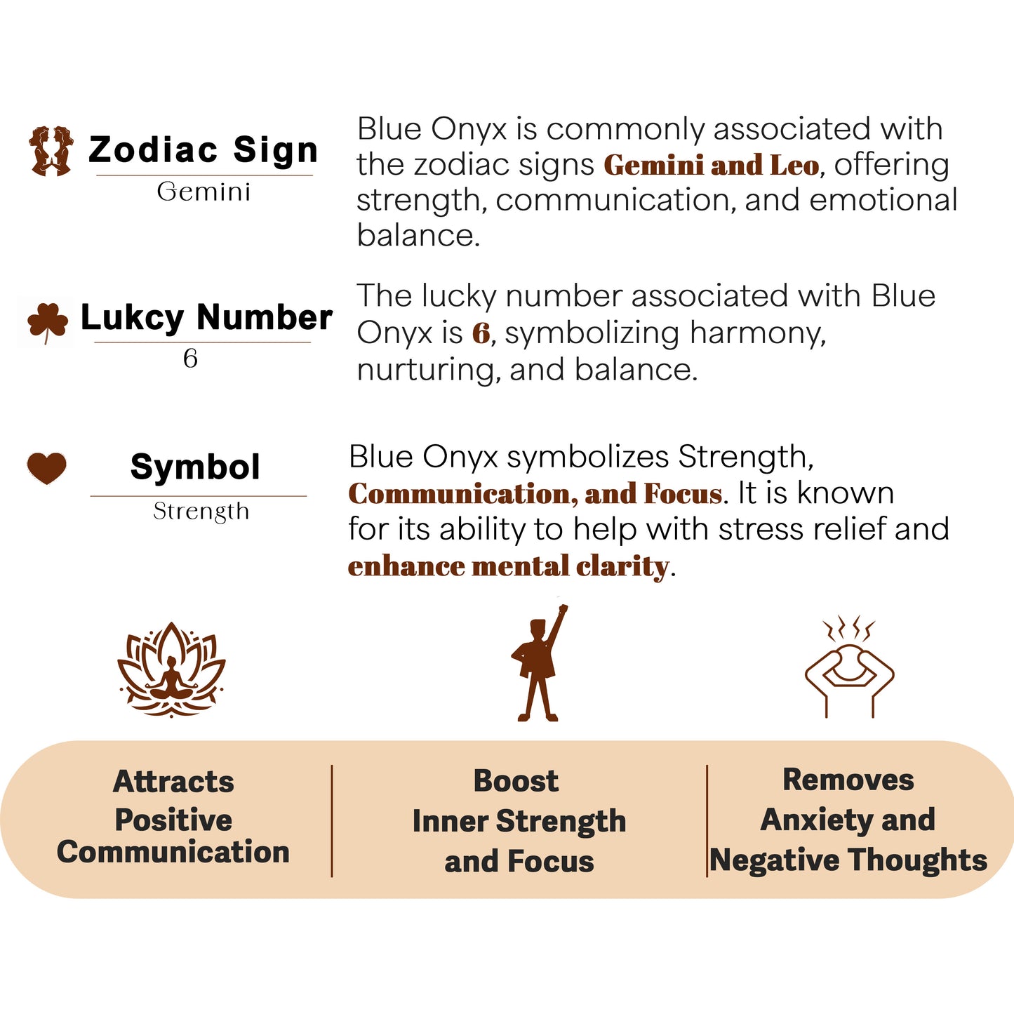 • Strength and Emotional Balance: Blue onyx promotes inner fortitude, alleviates anxiety, and stabilizes emotions during challenging times.