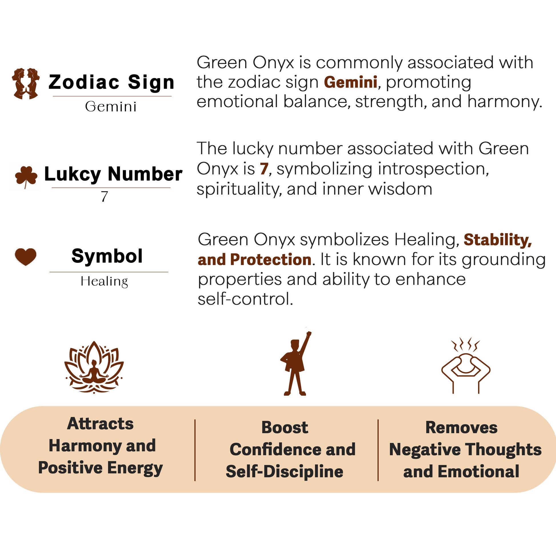 • Green Onyx: Enhances emotional balance, patience, and compassion