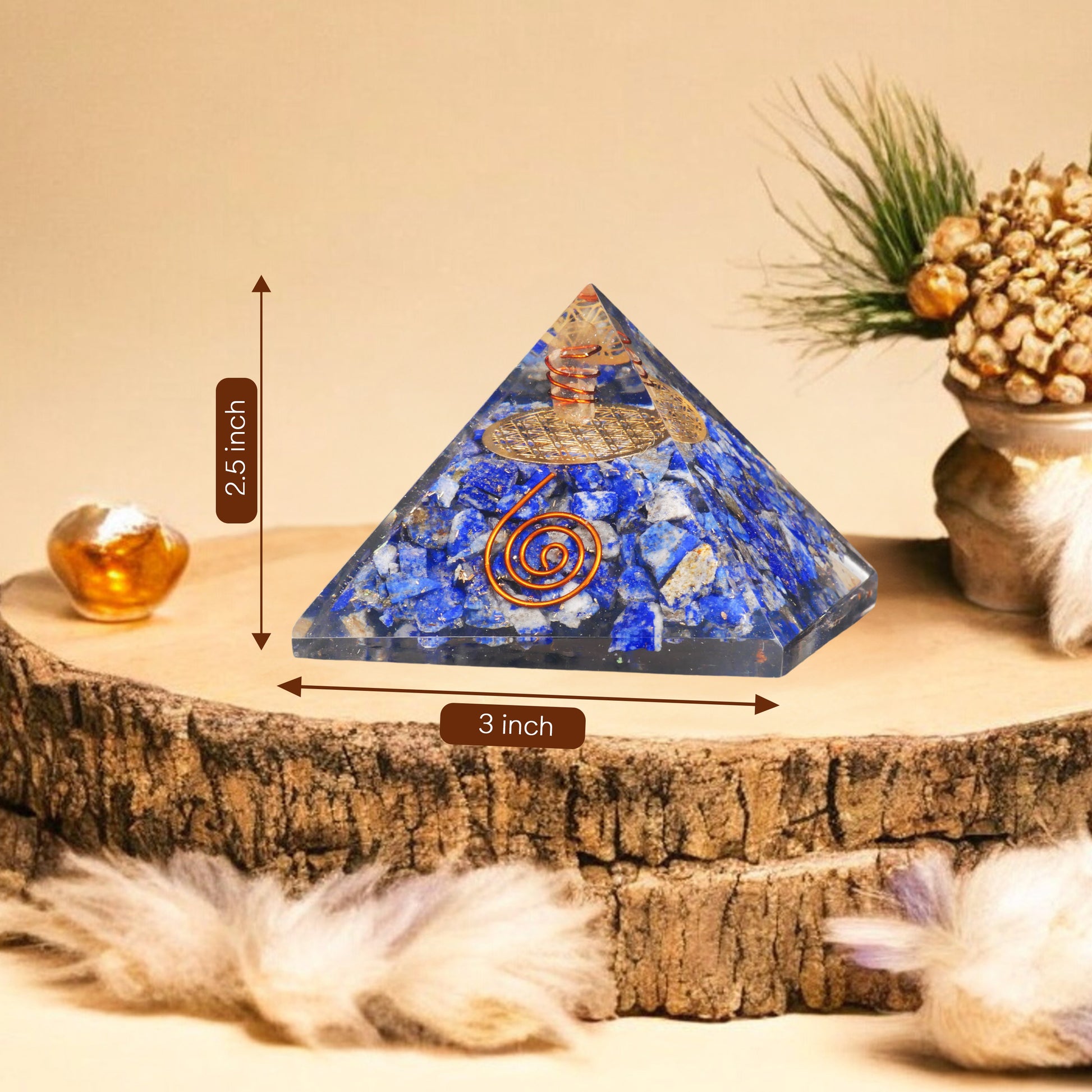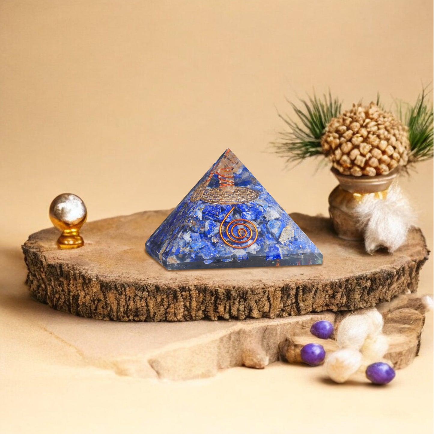 The Lapis Lazuli Orgone Pyramid is a powerful energy tool designed to enhance wisdom, truth, and intuition. Lapis Lazuli, a stone of mental clarity and spiritual growth, is known for awakening inner vision and accessing higher realms of consciousness. Embedded with a copper coil and the Flower of Life symbol, this pyramid amplifies the energetic flow, providing harmony and protection in your environment.