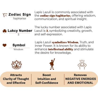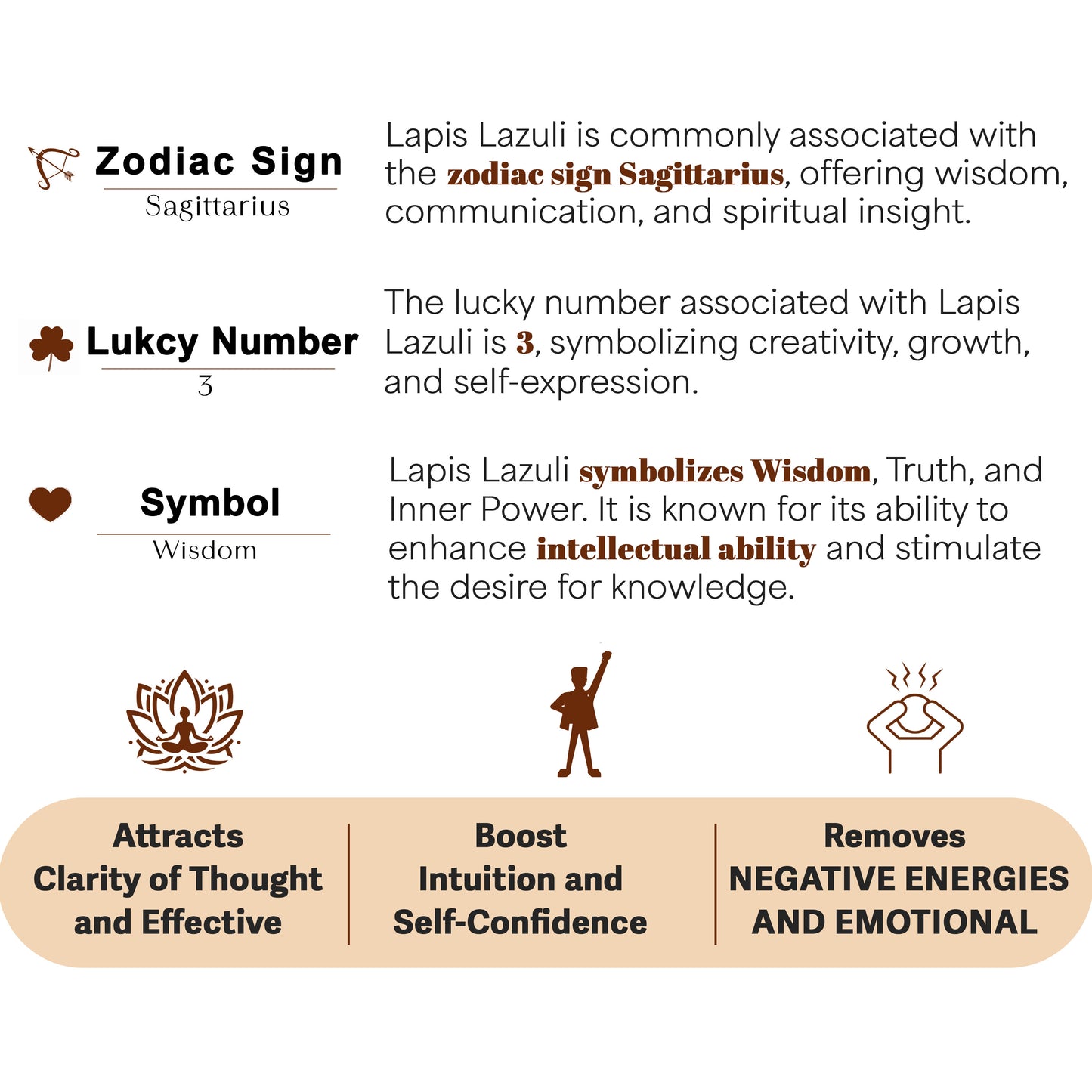 • Wisdom & Intuition: Lapis Lazuli is a stone of wisdom, helping you gain insight and self-awareness. It enhances the ability to think clearly, promoting inner truth and honesty.