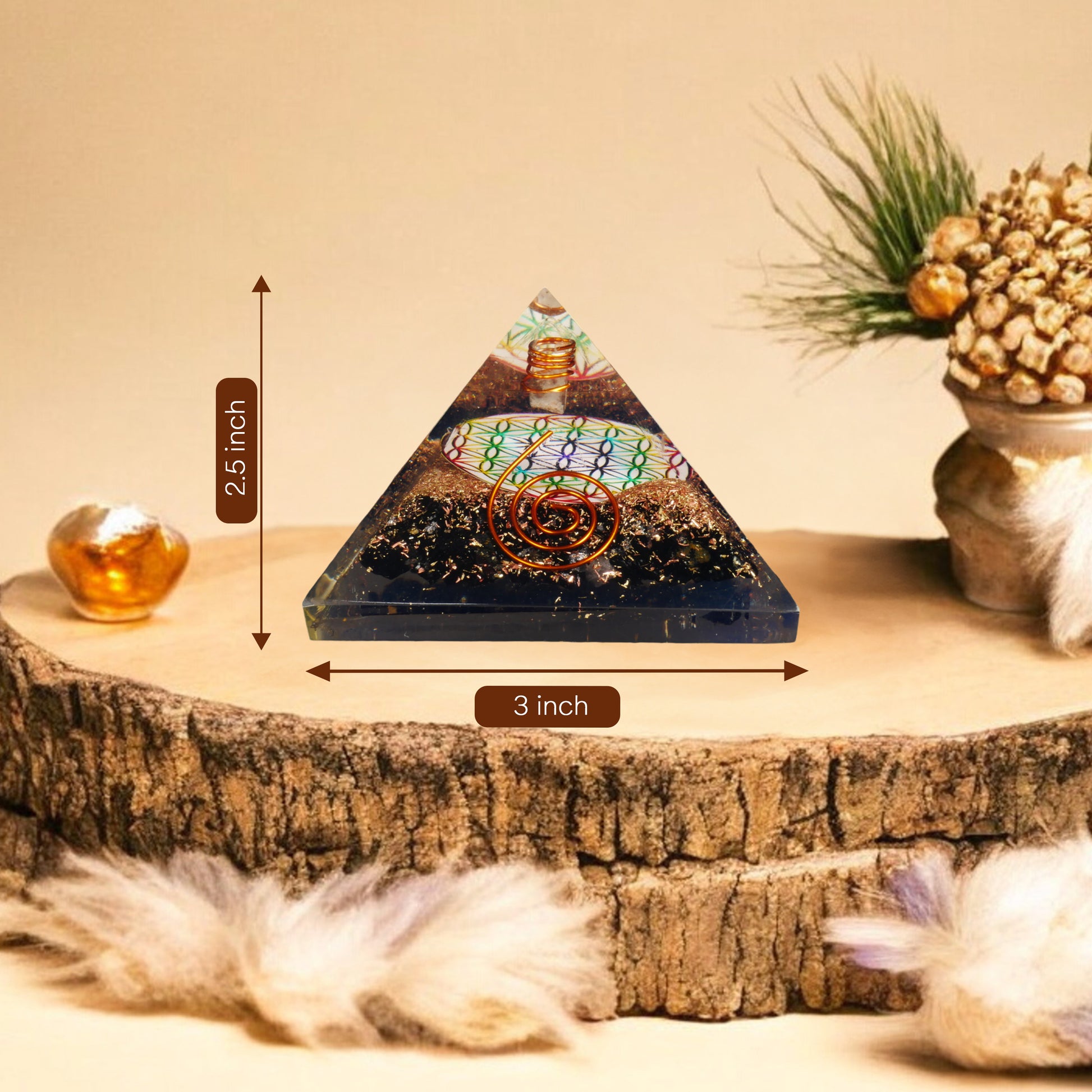 This pyramid features a copper coil to amplify and enhance the energy of Purple Onyx and Green Onyx. The copper coil acts as an energy conductor, ensuring the protective and balancing vibrations of the crystals are distributed evenly throughout your space.