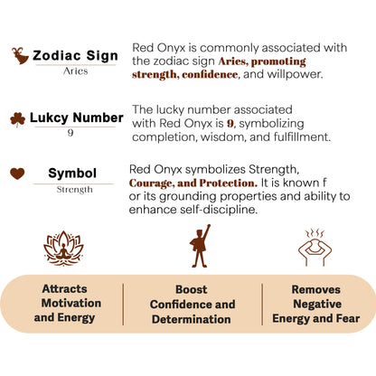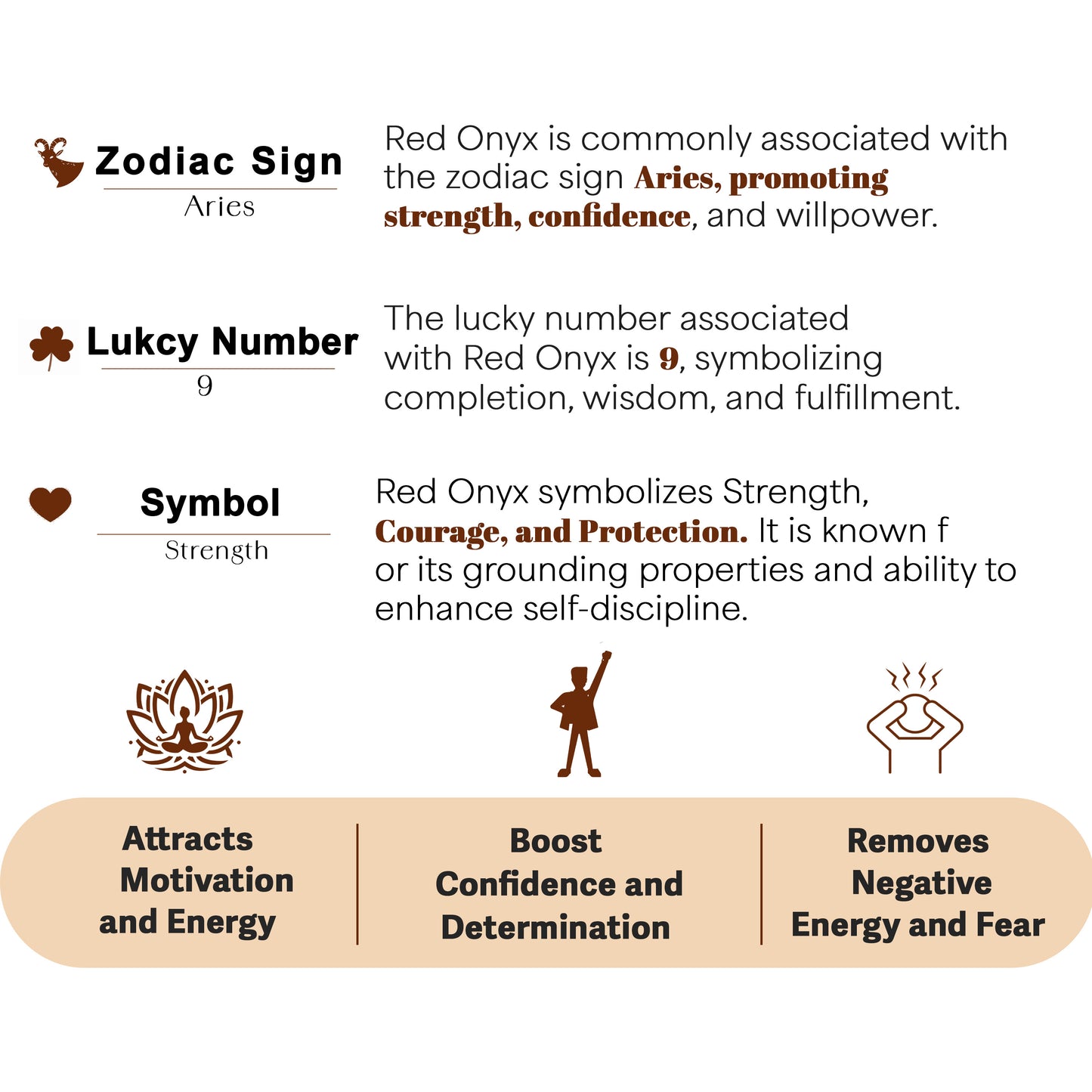 • Boosts Energy and Vitality: Red onyx is known for its energizing qualities, helping to stimulate motivation and enthusiasm, which can aid in overcoming procrastination and achieving goals.