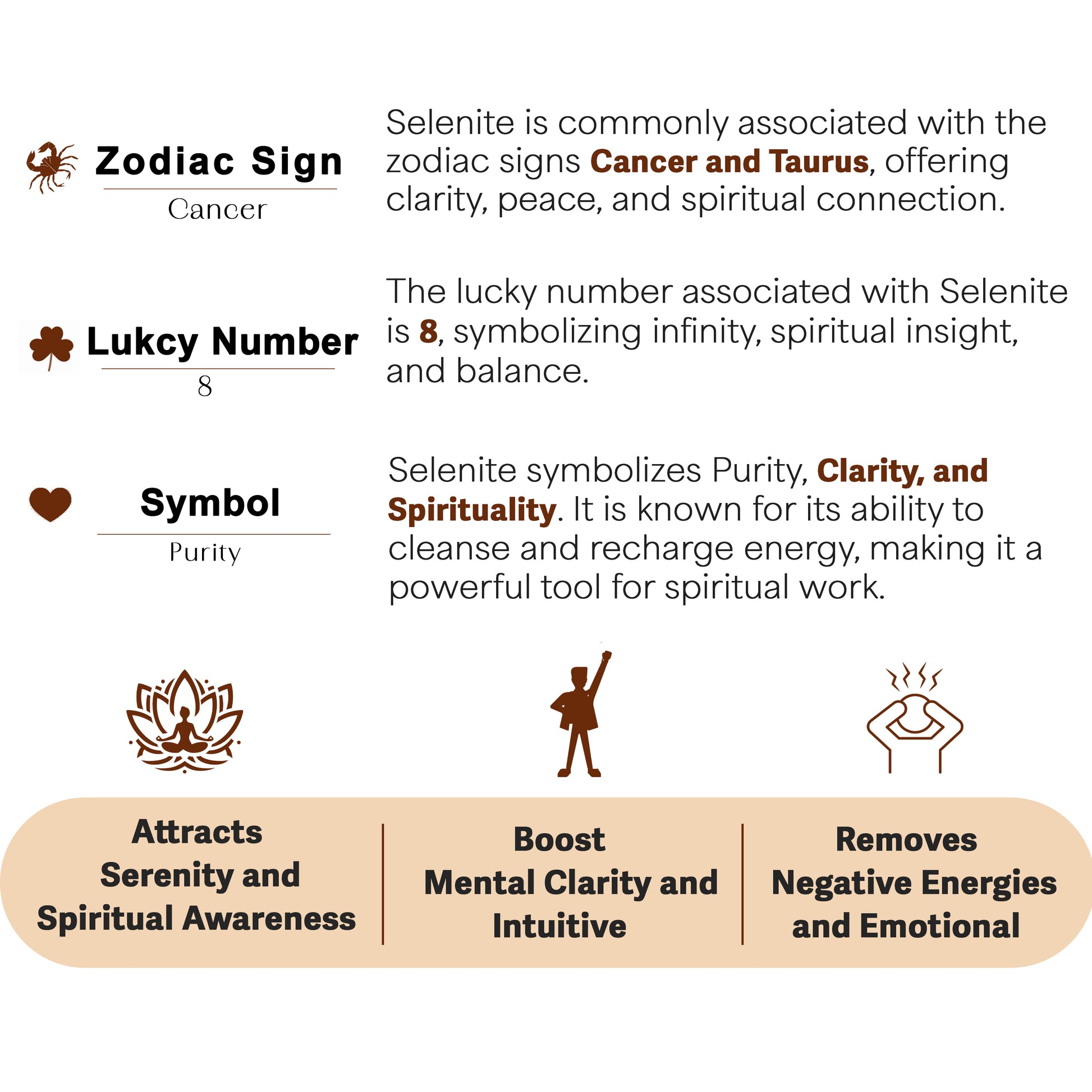• Energy Cleansing: Known as a powerful purifier, Selenite cleanses and dispels negative energies from your aura and environment, creating a balanced and peaceful atmosphere.
