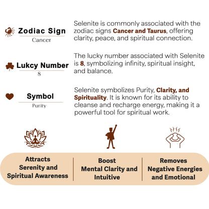 • Spiritual Growth: Selenite supports spiritual connection, opening up higher consciousness and aligning with divine energies.