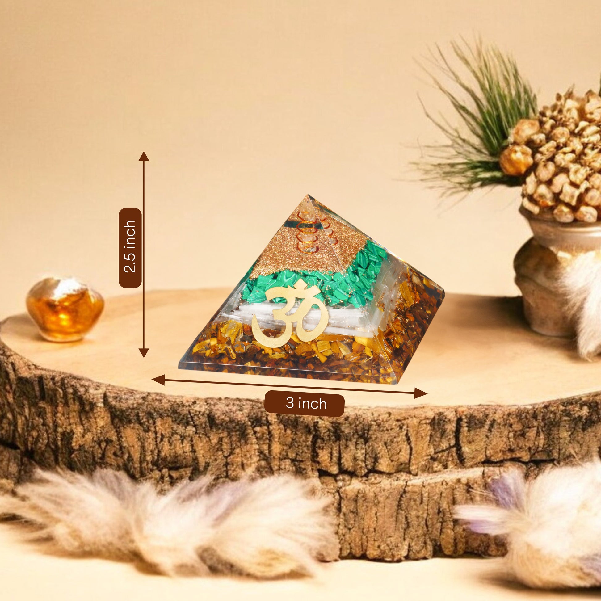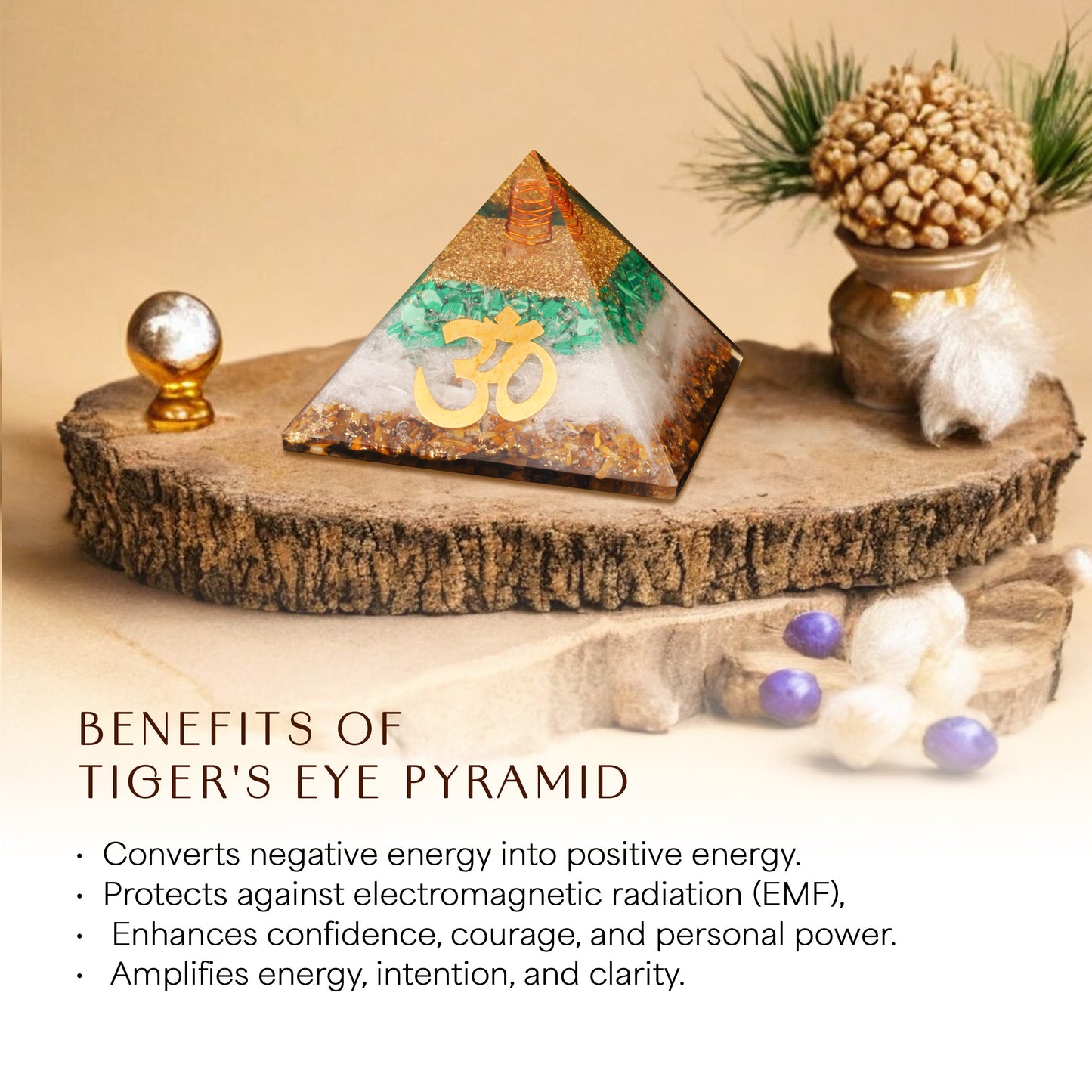 The pyramid features a copper coil that amplifies and balances the energy flow between the three crystals. The coil works as an energy conductor, ensuring that the protective, healing, and clarifying energies of Tiger Eye, Malachite, and Selenite are harmonized and radiate powerfully.