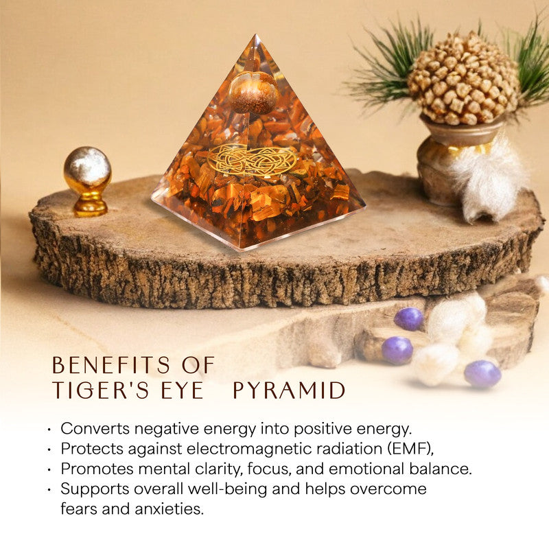 The Tiger Eye Pyramid is a unique combination of the grounding energy of Tiger Eye and the stabilizing influence of Lucky Number 4. This pyramid not only enhances your space with its beauty but also serves as a powerful tool for protection, focus, and emotional balance.